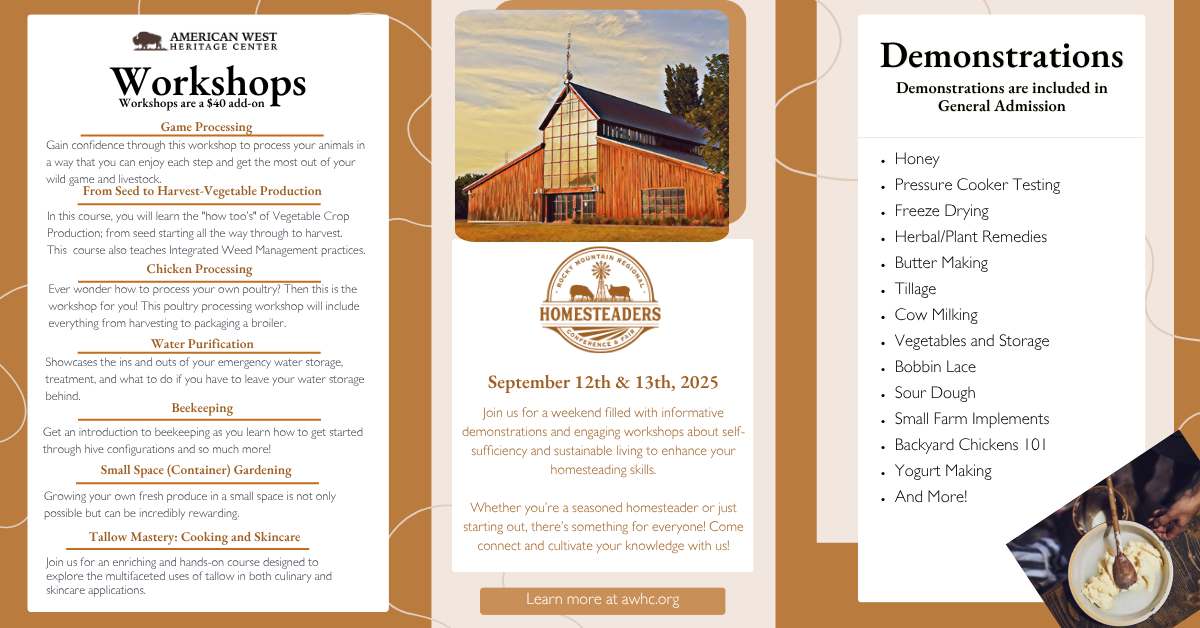 Welcome to the Rocky Mountain Regional Homesteaders Conference and Fair – Back to the Basics. A gathering of like-minded individuals passionate about self-sufficiency and sustainable living. Join us for a weekend filled with informative demonstrations and engaging workshops to enhance your homesteading skills.